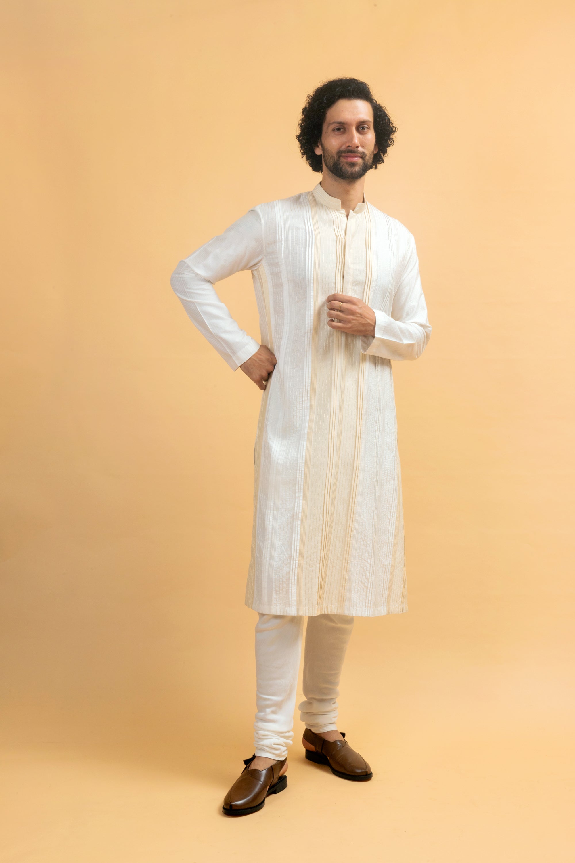 The neutral colour palette ensures that it can be styled in various ways, making it a versatile addition to any wardrobe. Pair it with brown leather juttis or mojari. Complete the look by accessorising it with a classy watch or a minimal bracelet.