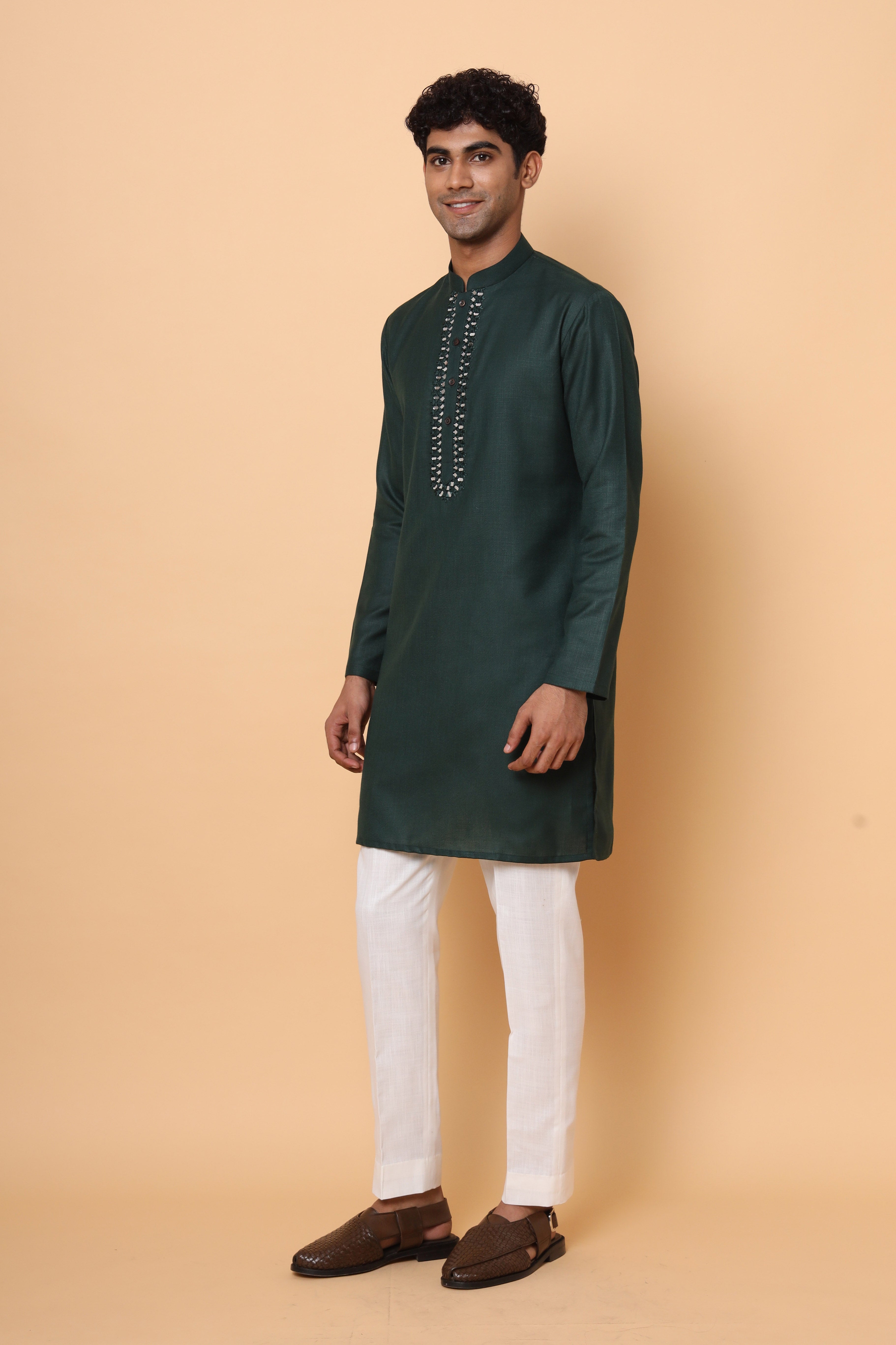 Elevate your look with traditional embroidered juttis or mojris for a touch of ethnic charm. Alternatively, opt for leather sandals or classic white sneakers for a more contemporary flair.Keep accessories minimal for a refined look. A stylish wristwatch and a single statement ring can complement the ensemble without overwhelming it. Pay attention to grooming, ensuring a well-kept appearance. Whether you choose a neatly styled hairdo or a casually tousled look, it should enhance your overall elegance.