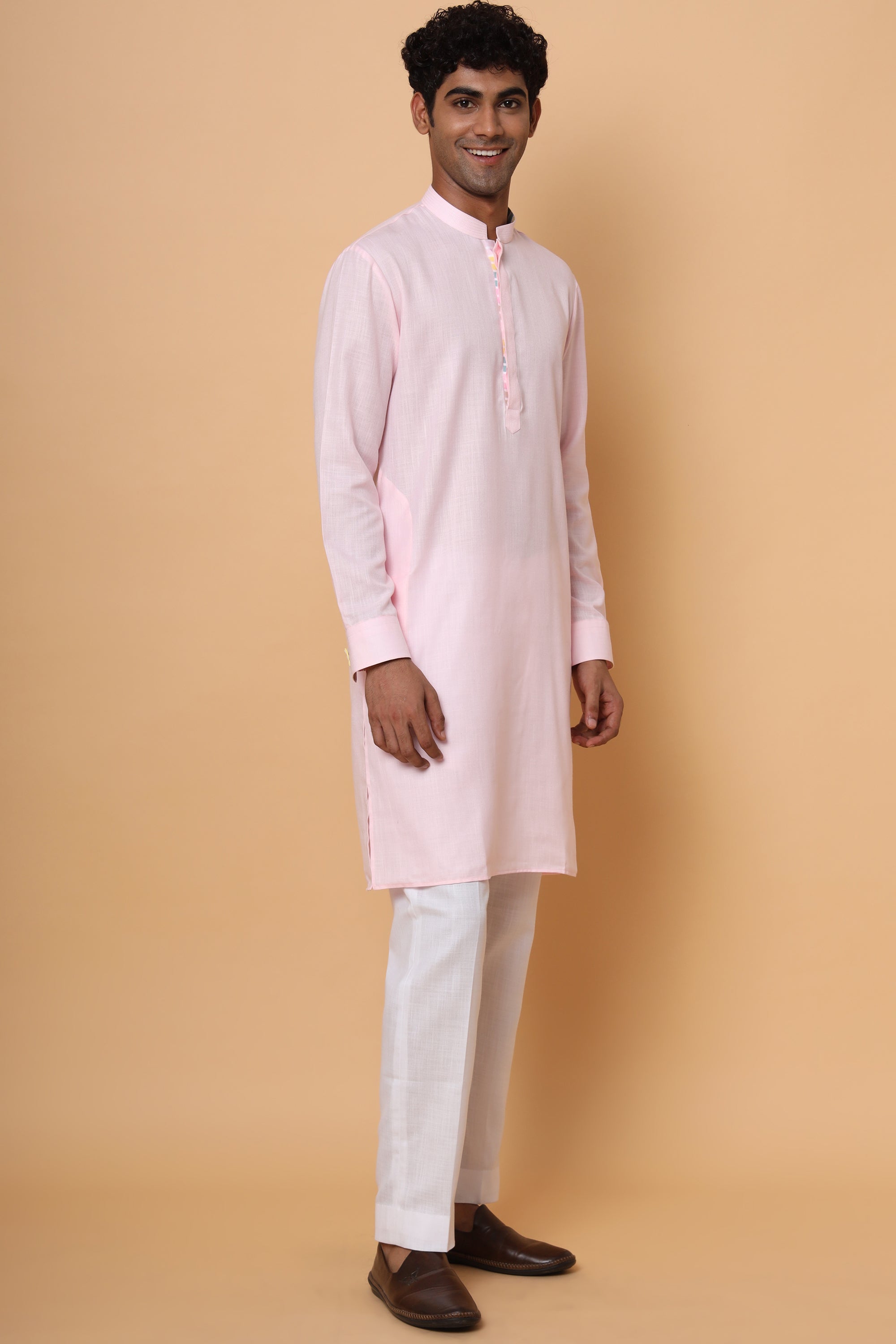 Pair this light pink kurta set with traditional juttis or mojris for a classic look, or experiment with chic loafers for a fusion twist. Add subtle jewelry, like a delicate bracelet, to accentuate the elegance of the ensemble. Whether you're attending a wedding, a cultural event, or a festive celebration, this kurta set is your perfect companion, promising compliments and admiration wherever you go.