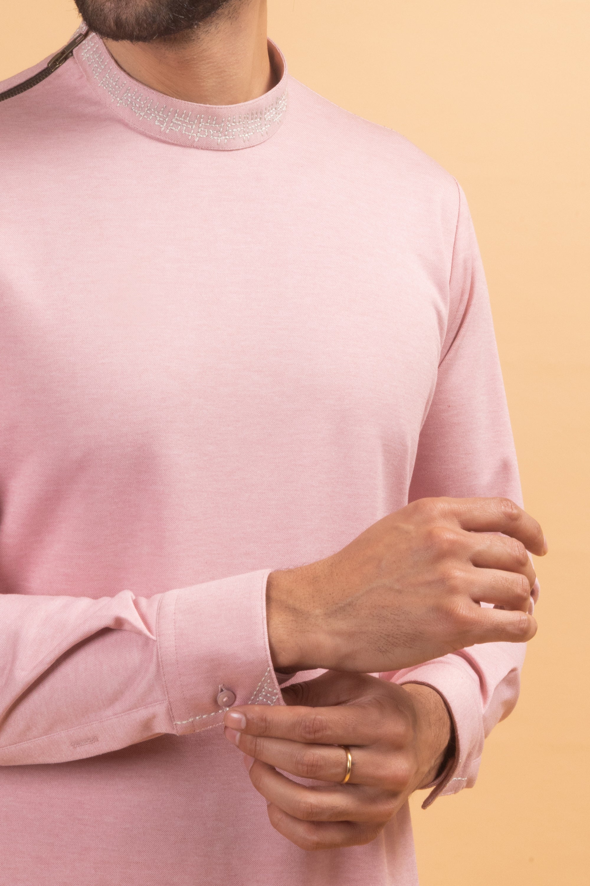 The rose colour of the kurta is quite bold. It is best to pair it with neutral-coloured bottoms like beige or grey to balance out the outfit. The kurta is already a statement piece so keep the accessories and additional layers to a minimum. A simple watch or bracelet can be a nice touch. Complete the look by pairing it with jutti or mojari for a traditional look.
