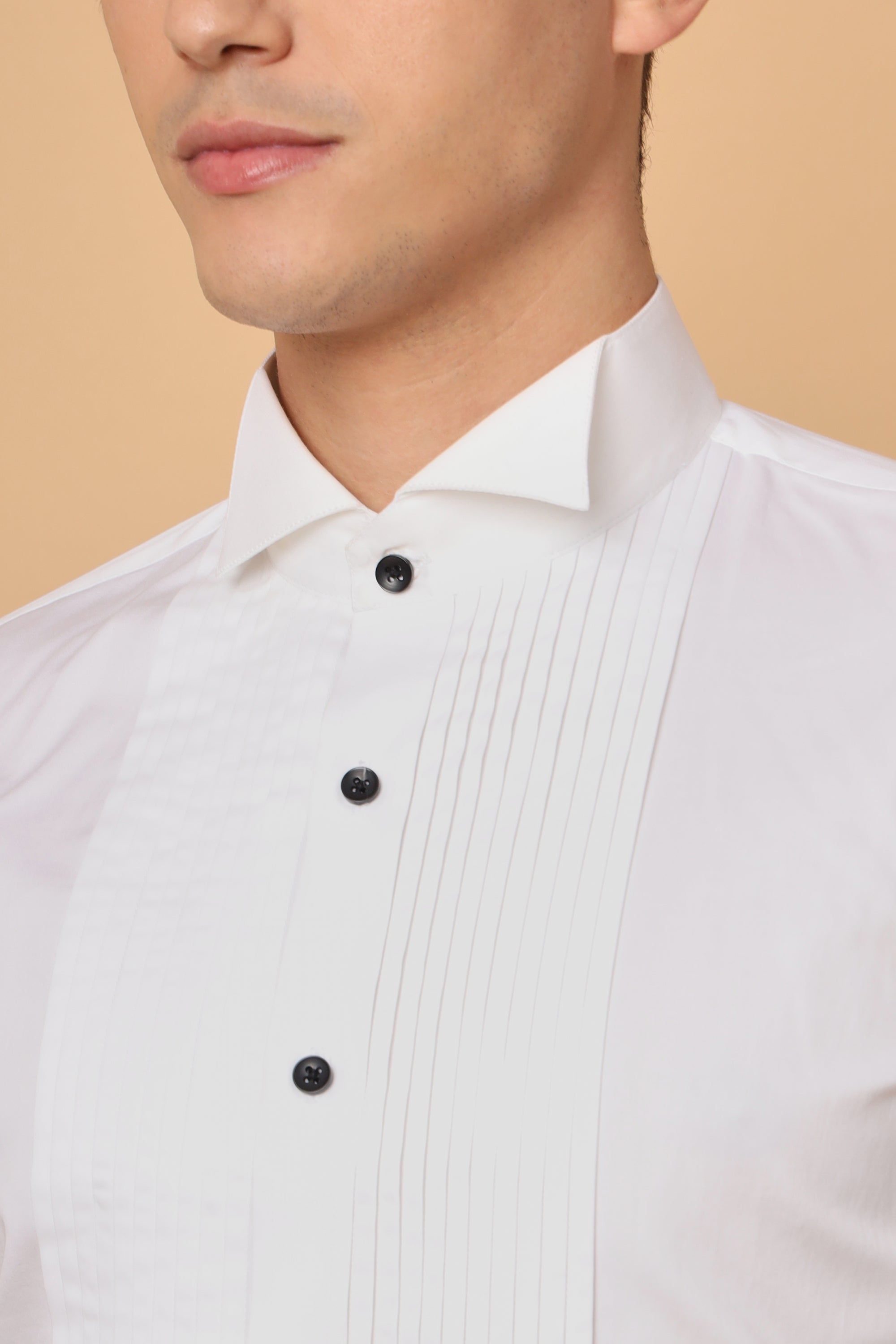 Style your Tuxedo Shirt for an impeccable formal look that commands attention. Pair it with a classic black tuxedo jacket and trousers for a timeless black-tie ensemble. Opt for a black bow tie to complement the wingtip collar, creating a refined and sophisticated neckline. The pleated front adds a touch of texture, while French cuffs invite the opportunity to showcase elegant cufflinks. Complete the look with polished black dress shoes to ensure a seamless transition from head to toe.