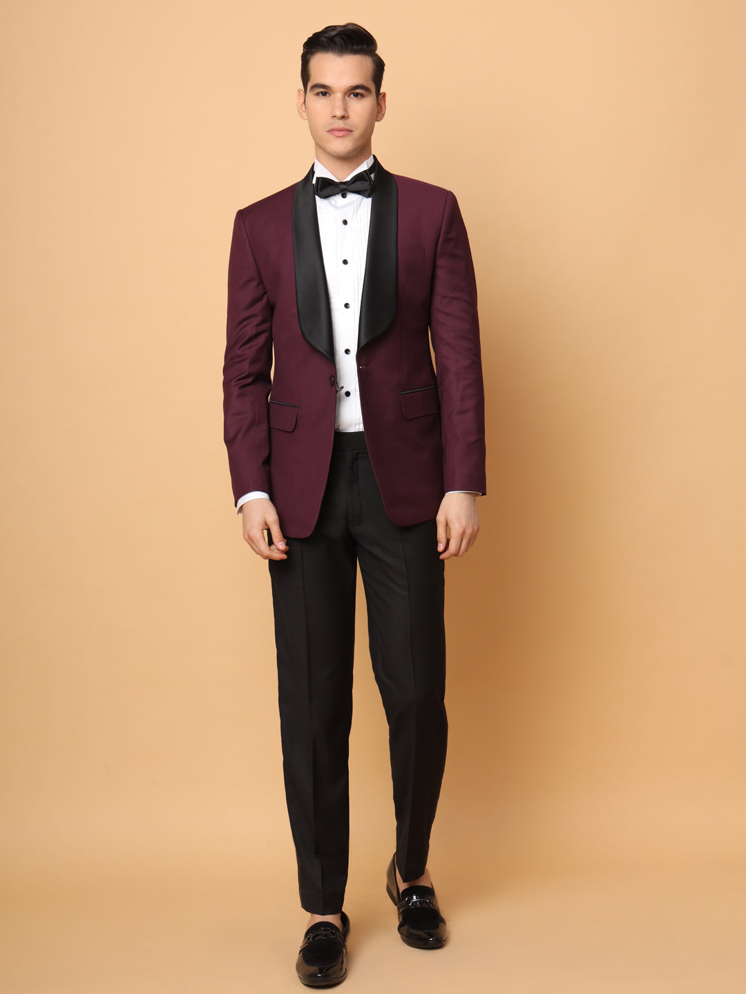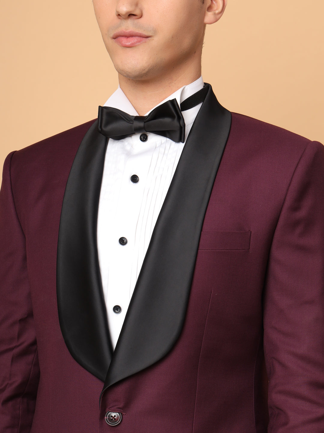 Dazzle the crowd in our Maroon Rayon Tuxedo. Pair it with a crisp white shirt, a sleek black bow tie, and tailored black trousers for a look that seamlessly blends modernity and classic charm. The satin black collar adds a touch of luxury, while polished black dress shoes complete the ensemble. Elevate your formal style with subtle accessories like black cufflinks and a pocket square.